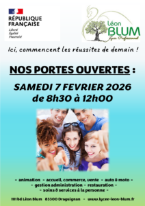 Le lycée professionnel Léon Blum a le plaisir de vous accueillir à notre journée portes ouvertes qui se déroulera le Samedi 07 Février 2026 de 8h30 à 12h00.